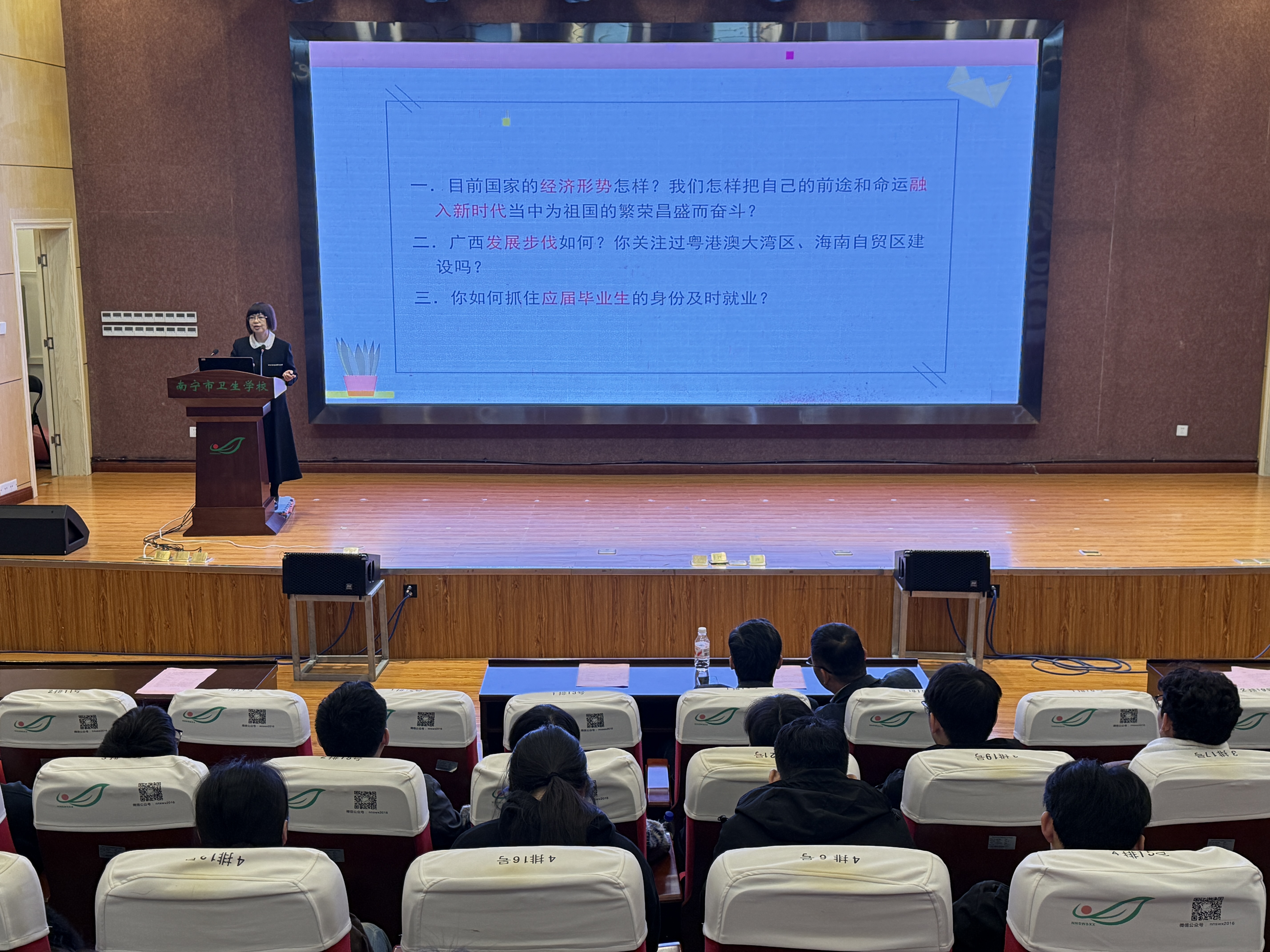 莫税英对南宁市卫生学校2026届“2+3”高职毕业生开展就业动员和就业指导,帮助毕业生认清就业形势,把握机会,积极主动就业。学院学生科科长莫书武给毕业生做求职指导专题讲座,围绕角色转变、简历制作和面试礼仪等关键环节为学生精准把脉。会后,莫税英一行到校园招聘会现场与用人单位就毕业生需求数量、毕业生培养质量进行交流,并指导、推荐毕业生就业。